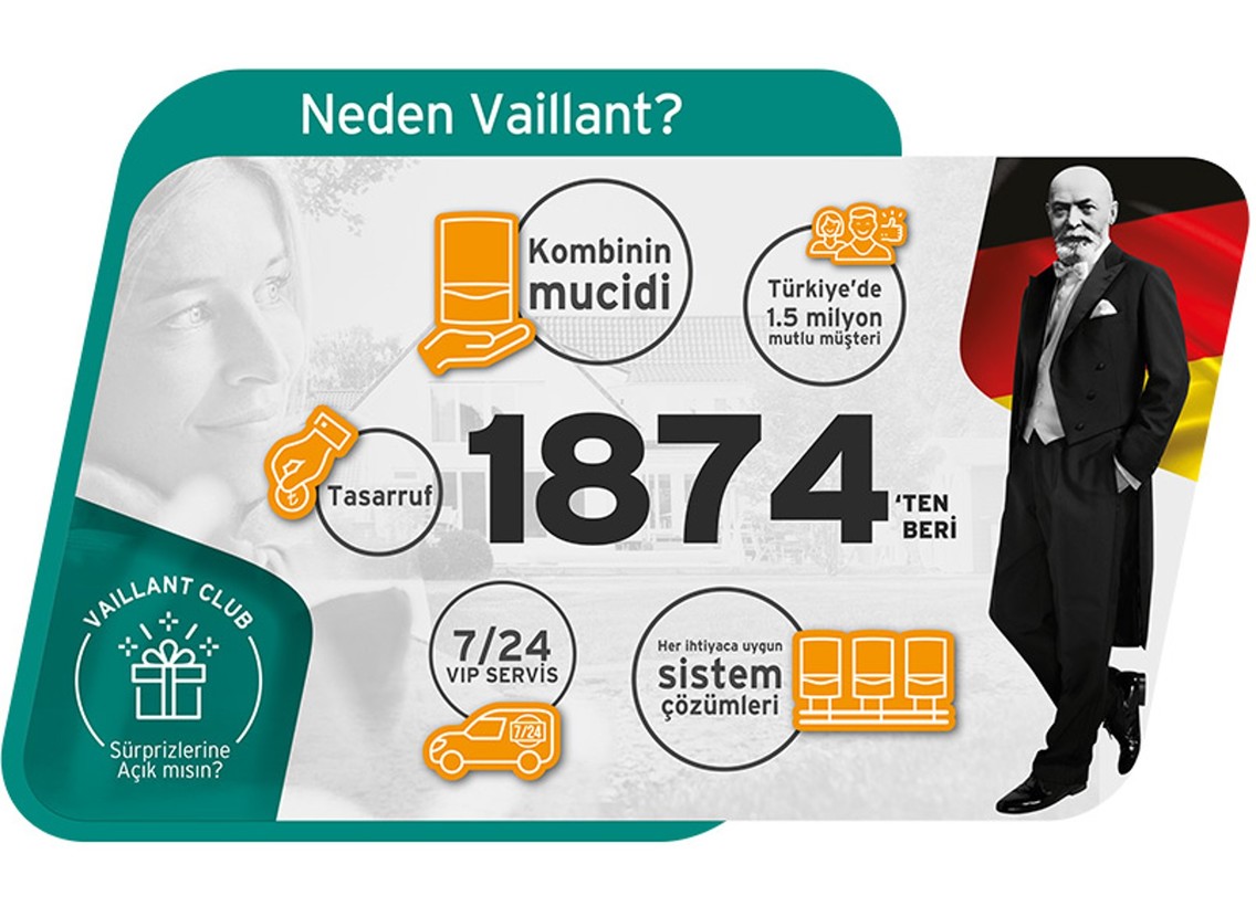 Vaillant Türkiye Kasım 1992’de tümüyle yabancı sermaye ile kuruldu. 20 seneden uzun bir süredir İstanbul Merkez ve İzmir, Adana, Ankara bölge müdürlüklerinde ve tüm yurda yayılmış yetkili satıcı ve servis teknikerleriyle en yüksek seviyede müşteri memnuniyeti için hizmet vermektedir.